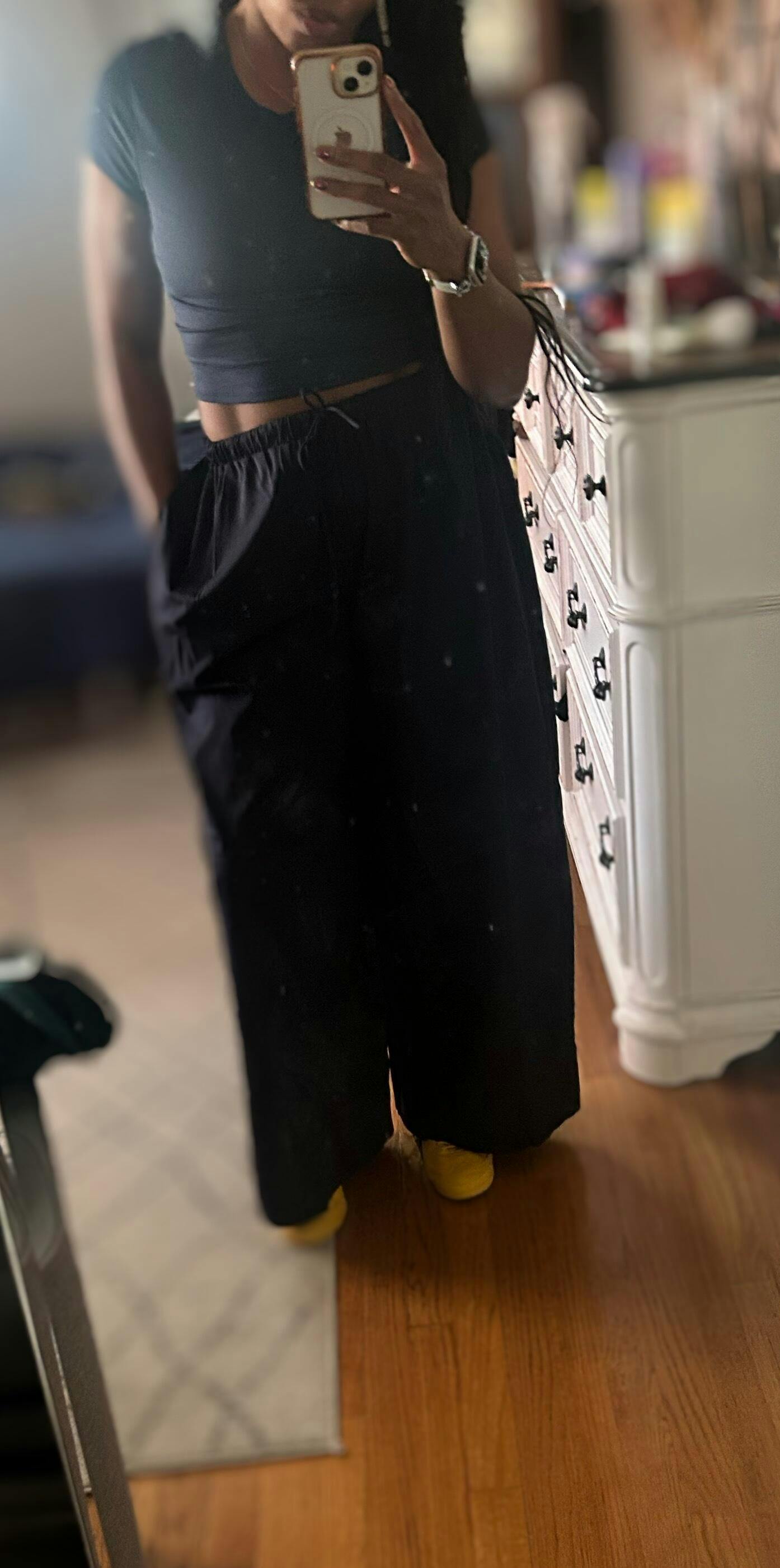 Looking for wide leg comfortable navy pants and came across this. They are super comfortable and stylish. I wish I went down a size but that’s ok as there is a draw string.