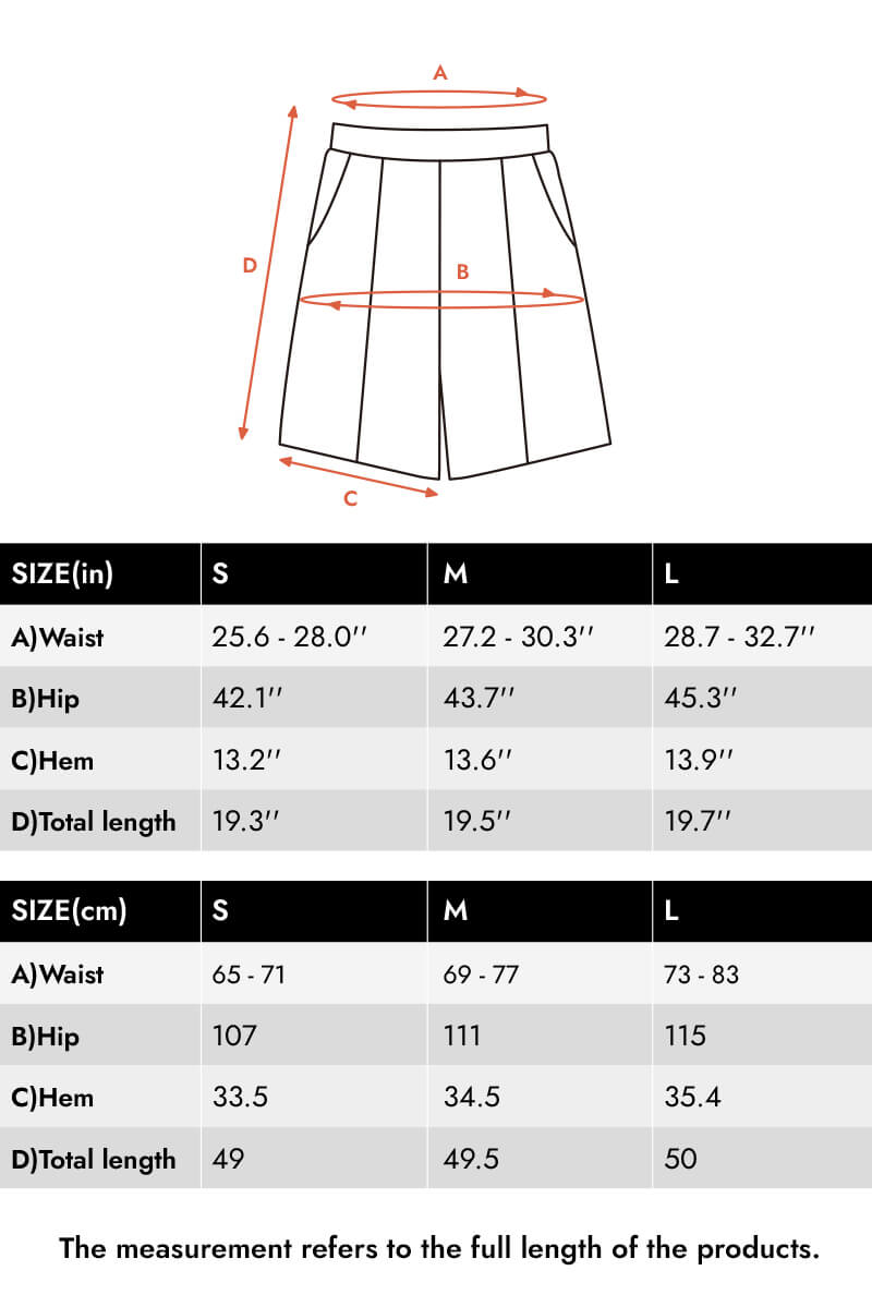 - Shorts: High waisted, drawstring to adjust waist, A-line shape