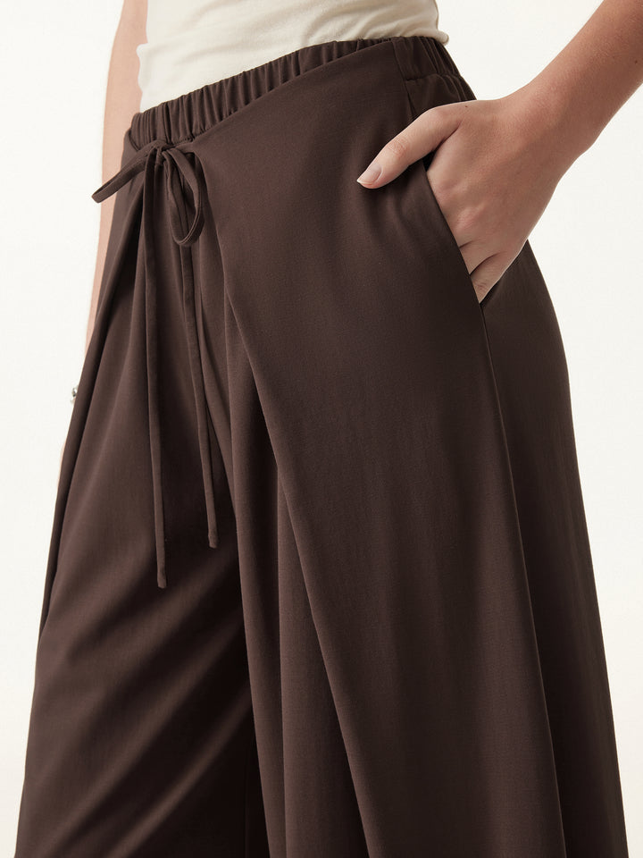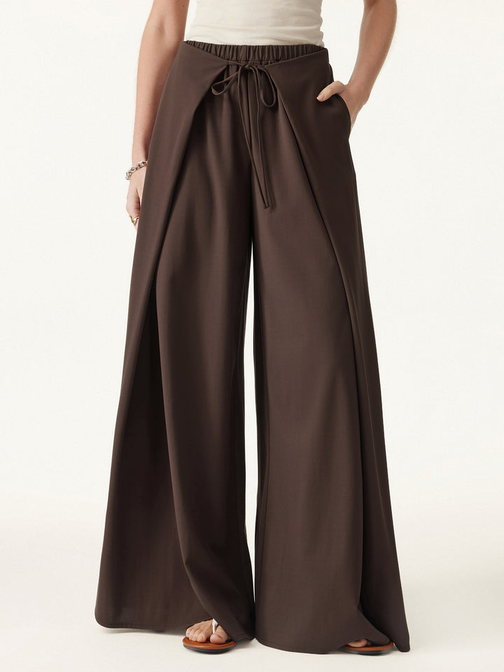 These mid-rise palazzo pants feature an easy elastic waist, pockets, and a unique flap front with a wrap tie design that gives you a polished, flowy look. Lightweight, comfy, and full of movement—just what you need for effortless days.