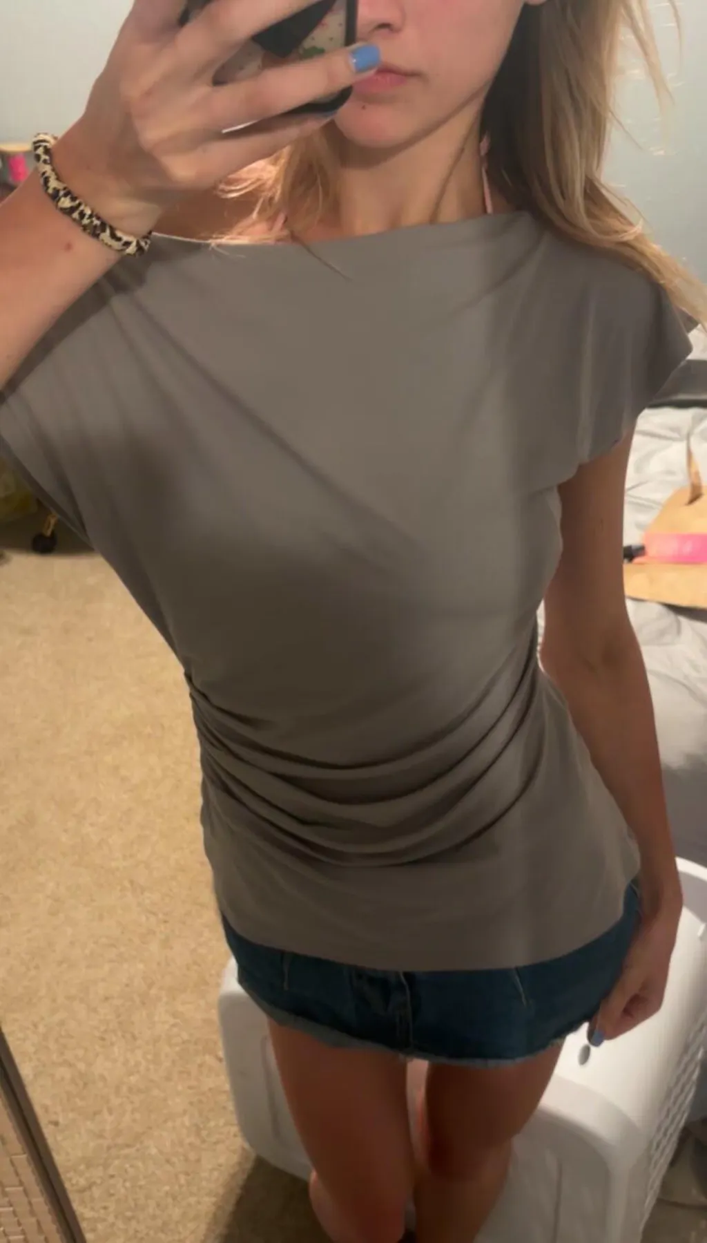 How is there a pastel blue I don’t hate? Another no bra situation, but it’s giving carefree elegance. I’m so glad I found this brand. I was looking for something that has more class and style than athleisure but have hit a time that I need comfort as well above all else. They knocked it out if they park. The quality is second to none. And there are reviews here about the ruching that don’t lie. My photo can’t do it justice. It looks good with everything and moves like you’re the lead in the movie. I feel like for travel or work travel (the peak of my struggles) this is what I’ve been waiting for. I am confident I can wear this to the “office” and for a night out with colleagues without loosing myself (style, shape, everything) and sacrificing style, comfort, or personality or showing too much skin or rolls. And it’s so flattering and stylish, I’d wear this to a party or casual night with friends as well. Never have I found such versatile, comfortable, classy, and high performing tops. And the fact that they’re sustainable fashion built to last with a decent price tag, I cannot.