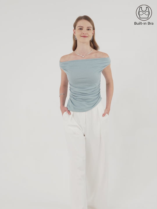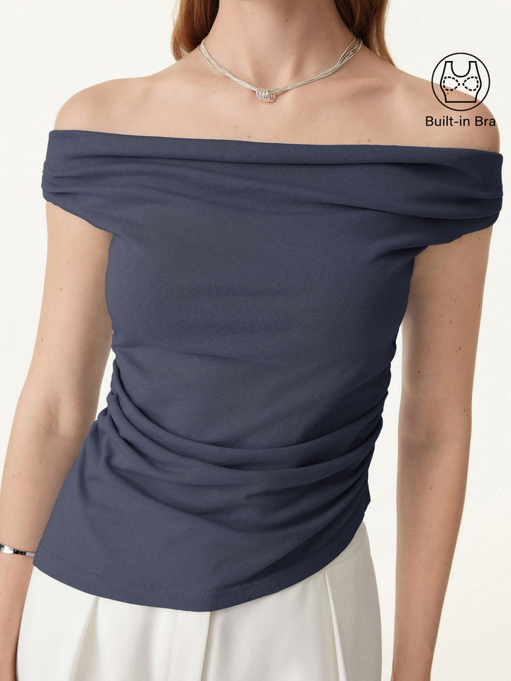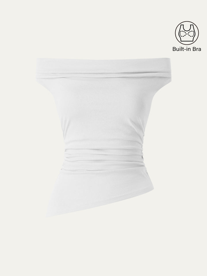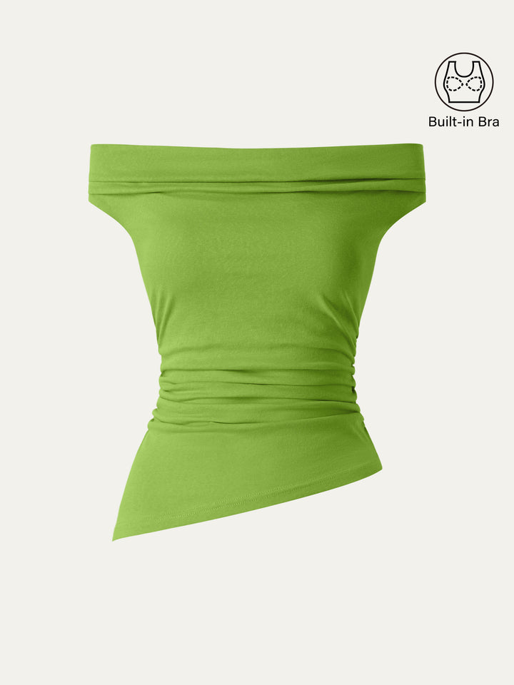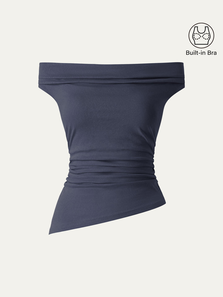 This slim-fit top features a chic cold shoulder cut, gathered sides, and an asymmetrical hem that brings all the drama—in the best way. With removable bra pads included, you’ll feel confident, comfy, and totally ready to stand out.