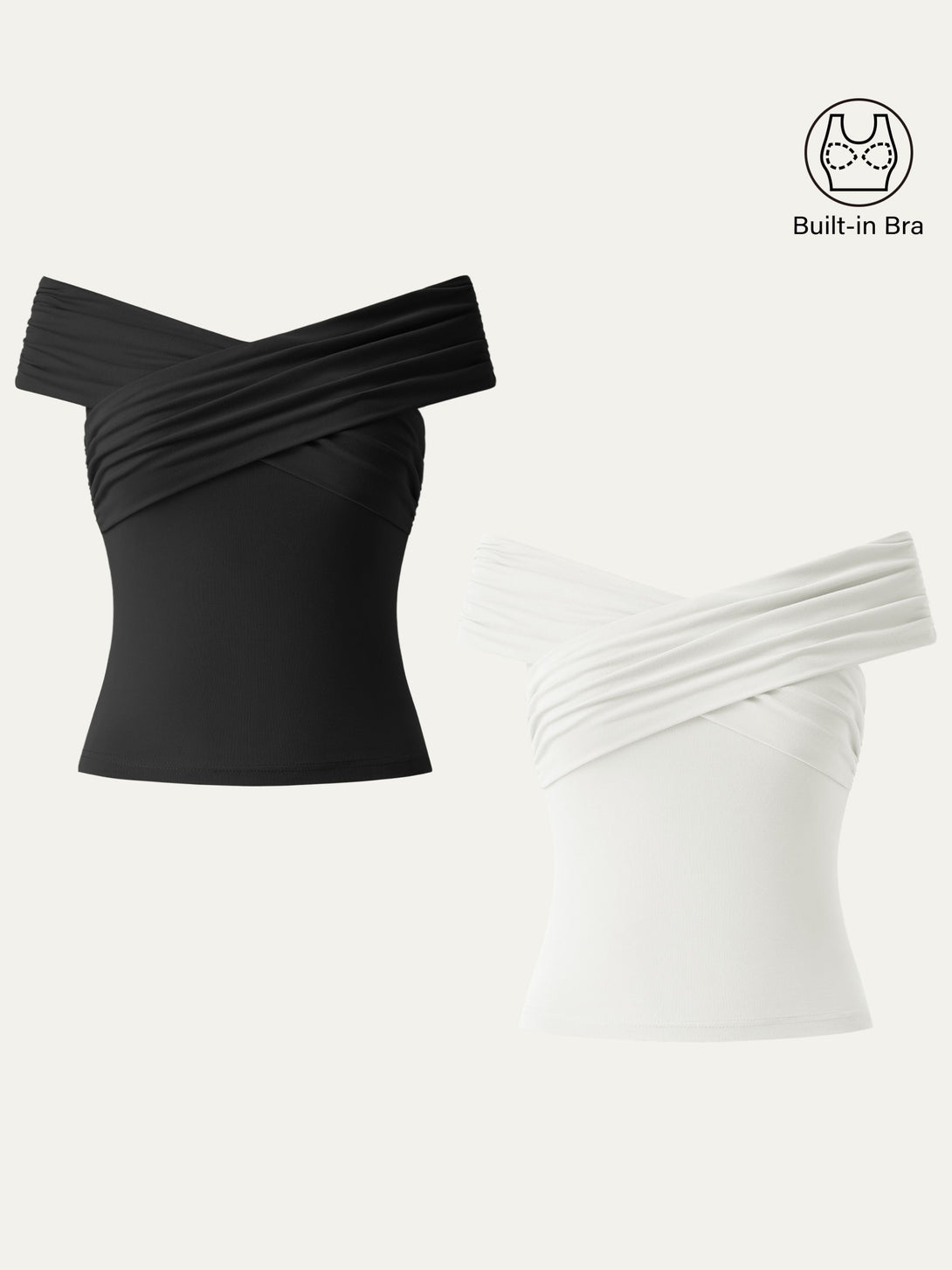 Wow, this crisscross off-shoulder top is so beautiful! It makes me look very elegant when I wear it. My friends said I looked like a different person. The fabric is very comfortable and breathable. The crisscross and gathering details are very unique and add to the fashion sense of the top. The built-in bra pads also fit well and there's no discomfort. I really love this top!