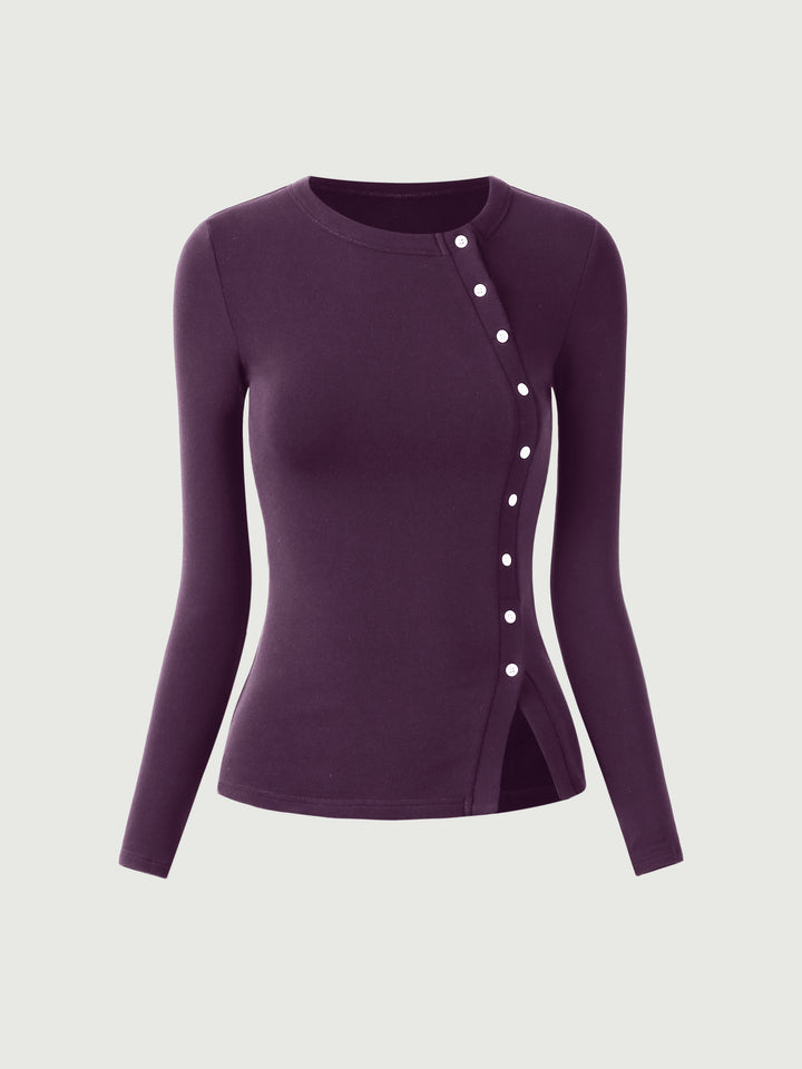 Add a modern twist to your everyday looks with our Eco-Mousse® Asymmetrical Placket Top. The off-centre button placket brings an effortlessly stylish edge to the clean, round-neck silhouette, while the long sleeves make it perfect for cool-weather layering. Pair with wide-leg trousers for a chic day-to-night outfit.