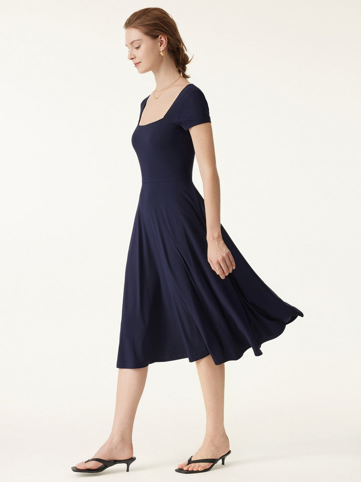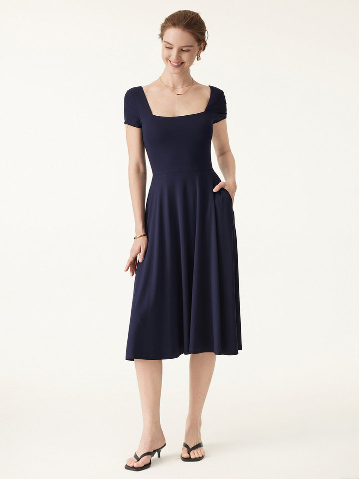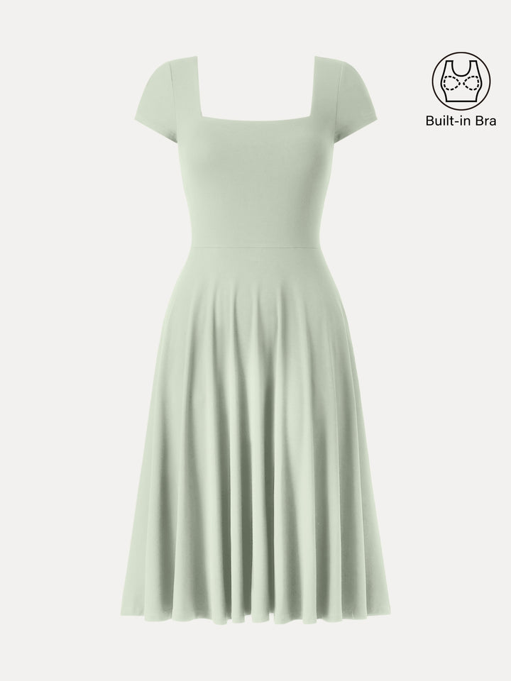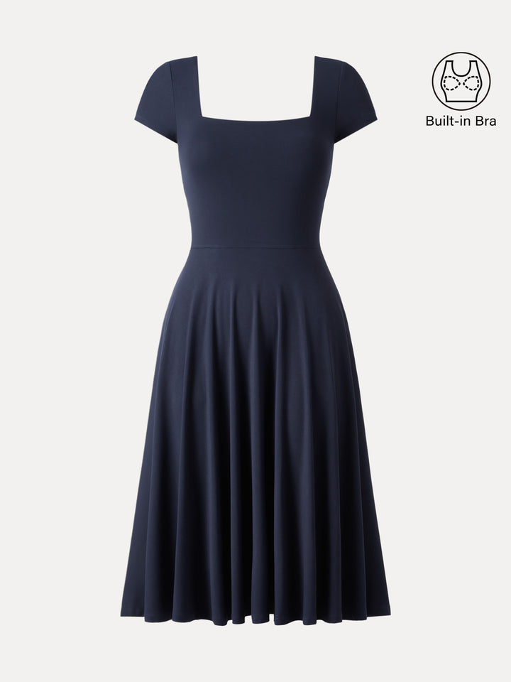 So flowy, it moves with you. Our bestselling dress now is with a fresh update. Featuring a flattering square neck, short sleeves, and a breezy midi length. Designed with removable bra pads for all-day comfort and ease.