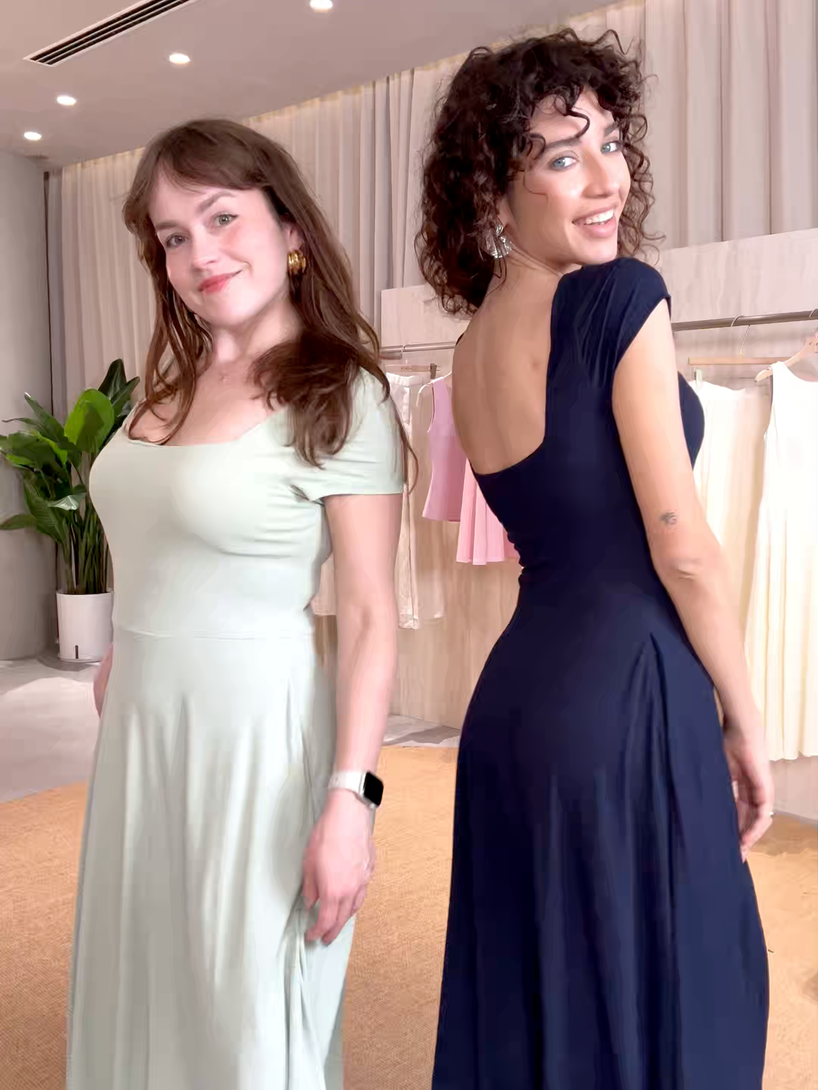 So flowy, it moves with you. Our bestselling dress now is with a fresh update. Featuring a flattering square neck, short sleeves, and a breezy midi length. Designed with removable bra pads for all-day comfort and ease.