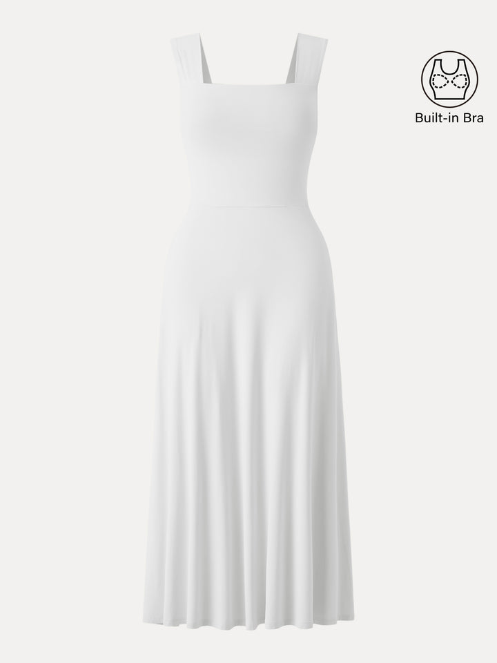 Clean lines, easy summer vibes. This slim-fit midi dress features a square neckline and wide shoulder straps for a flattering, structured look. With pockets and removable bra pads, it’s the go-to piece that keeps you cool and comfy.