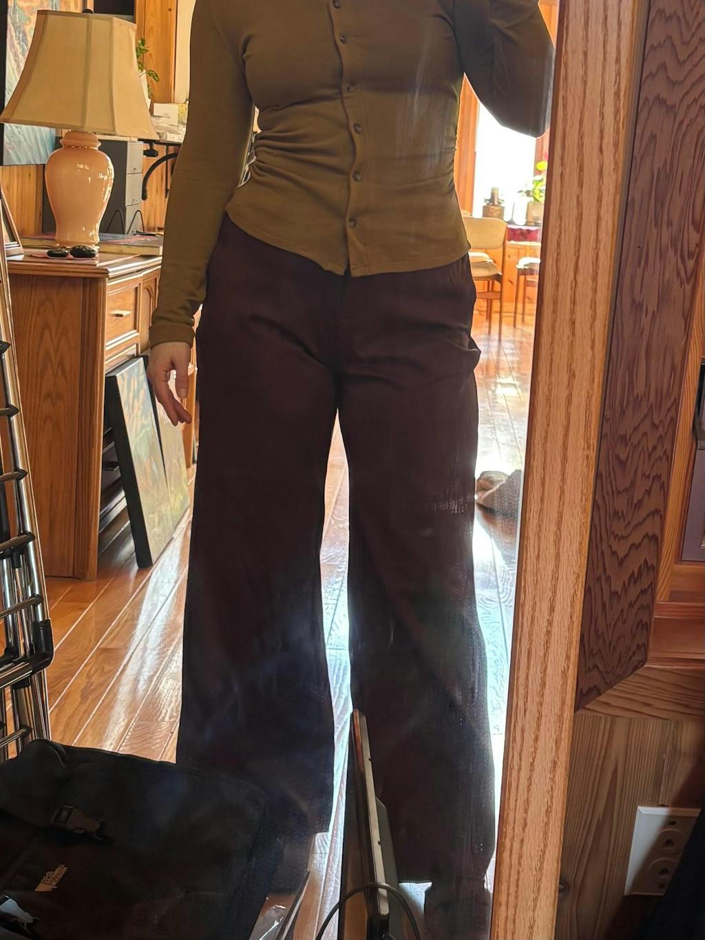 Super impressed with these pants. The colour is great (dark brown), the waist fits really well and the cut is pretty flattering. So comfy too.