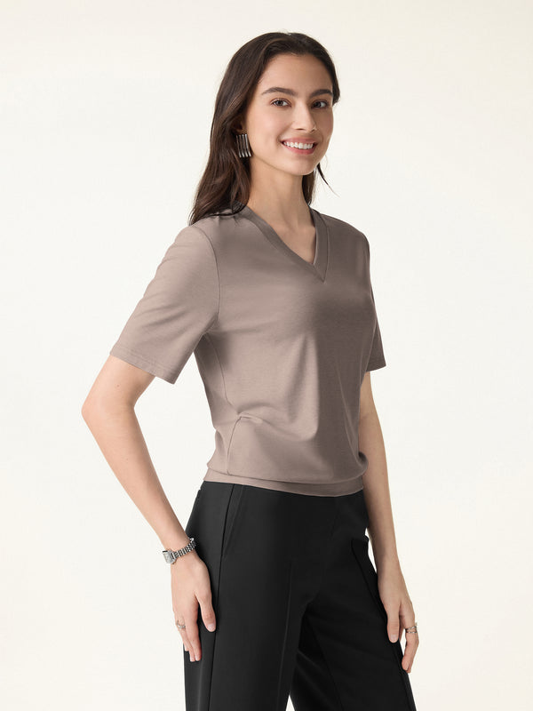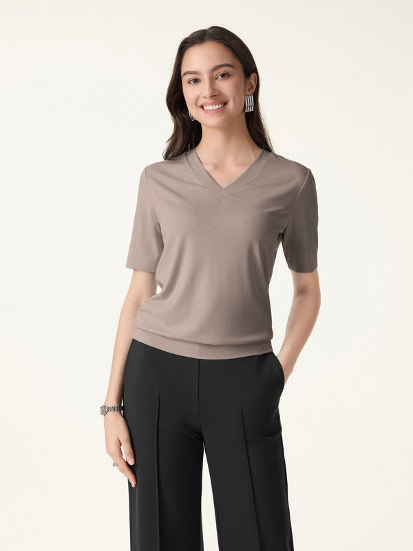 A summer tee with a little more shape and polish, thanks to the V-neck and banded hem that keep the relaxed fit looking intentional. The high-hip length and elbow sleeves make it easy to wear on its own or styled with high-rise bottoms.