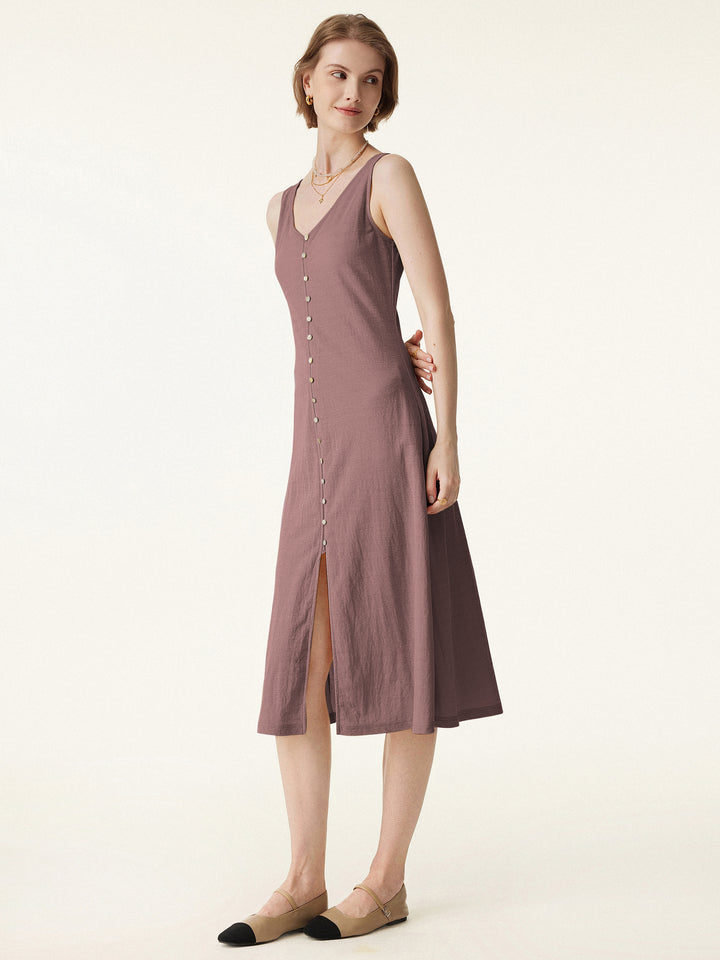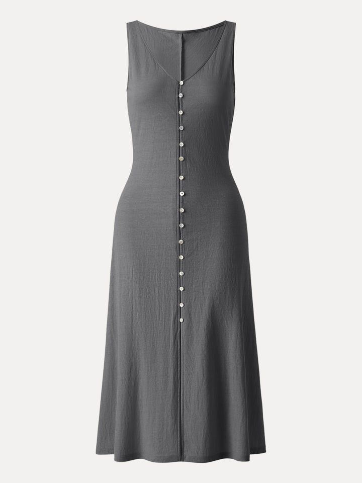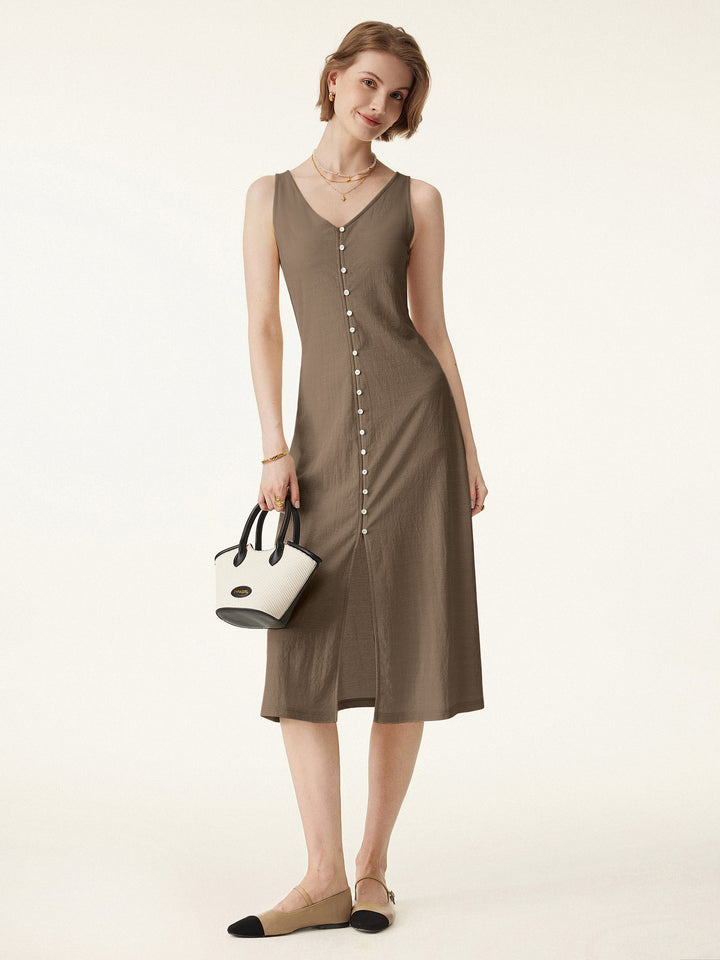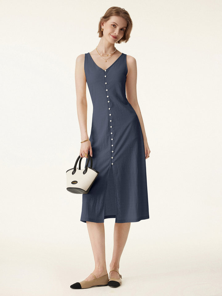 This versatile piece works as both a midi dress and a long vest. Designed with a flattering V-neckline, button front for styling flexibility, and an A-line silhouette that moves with ease. Regular fit keeps it effortless, no matter how you wear it.