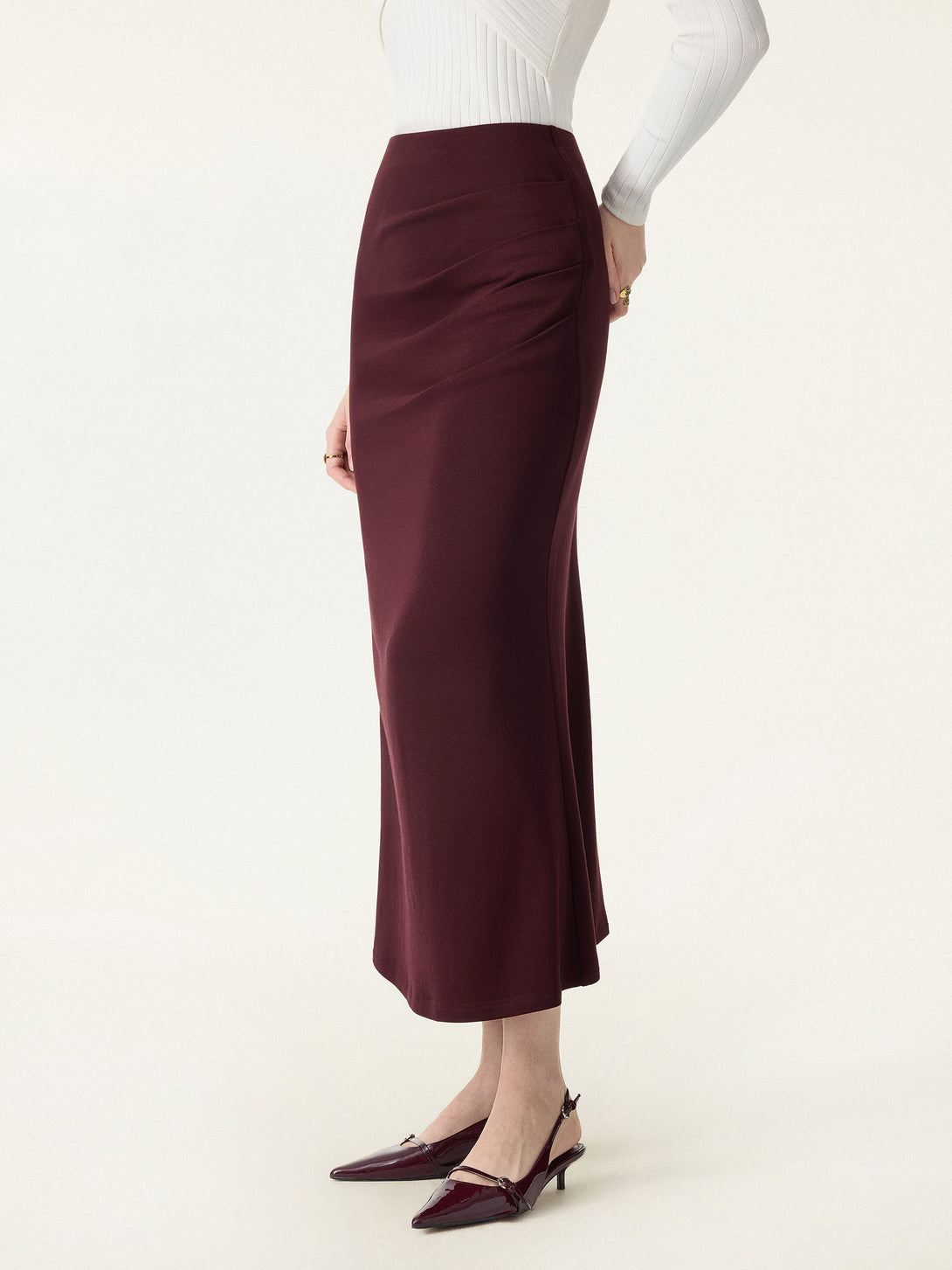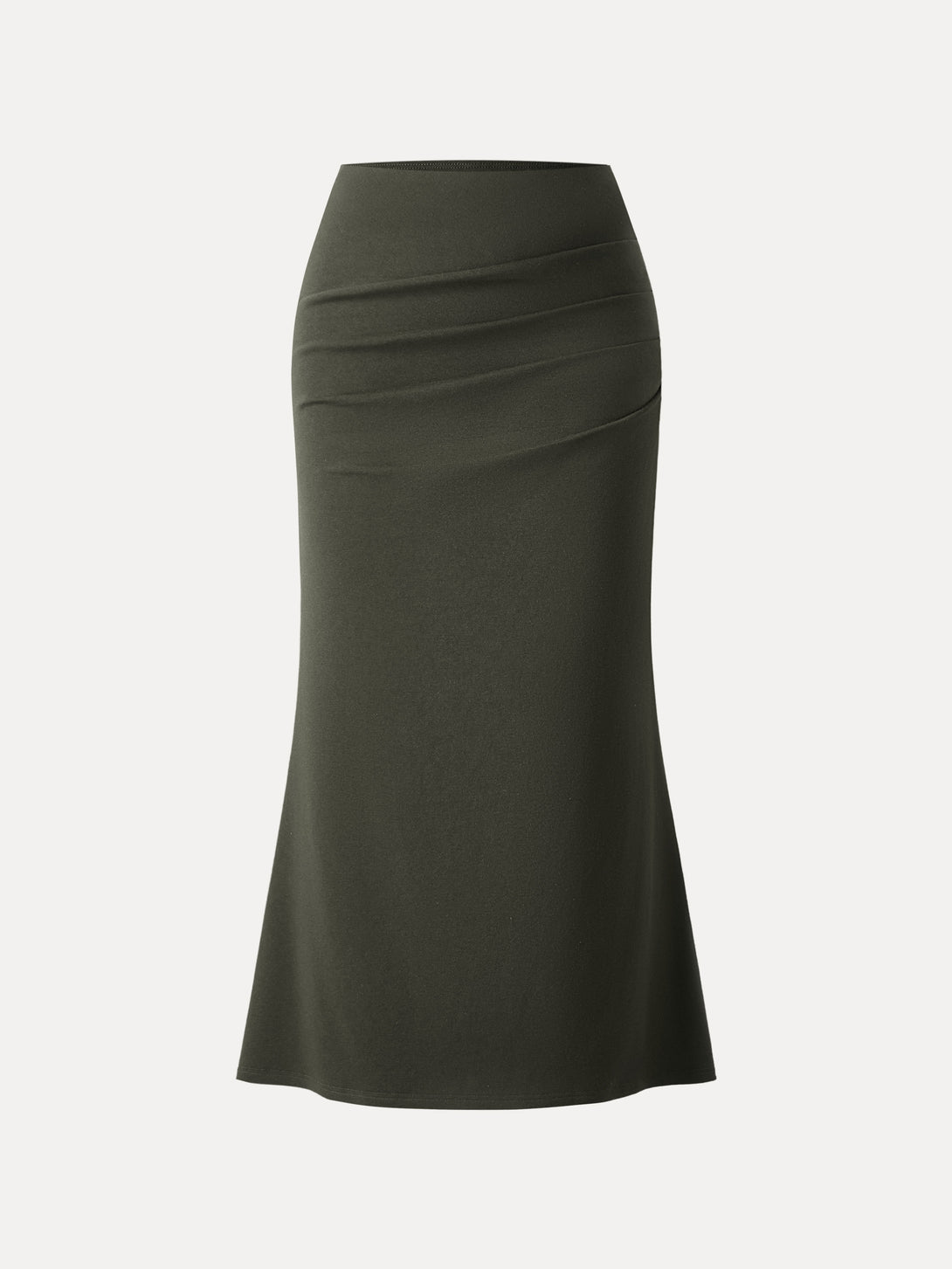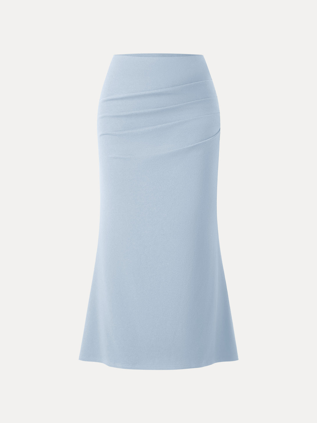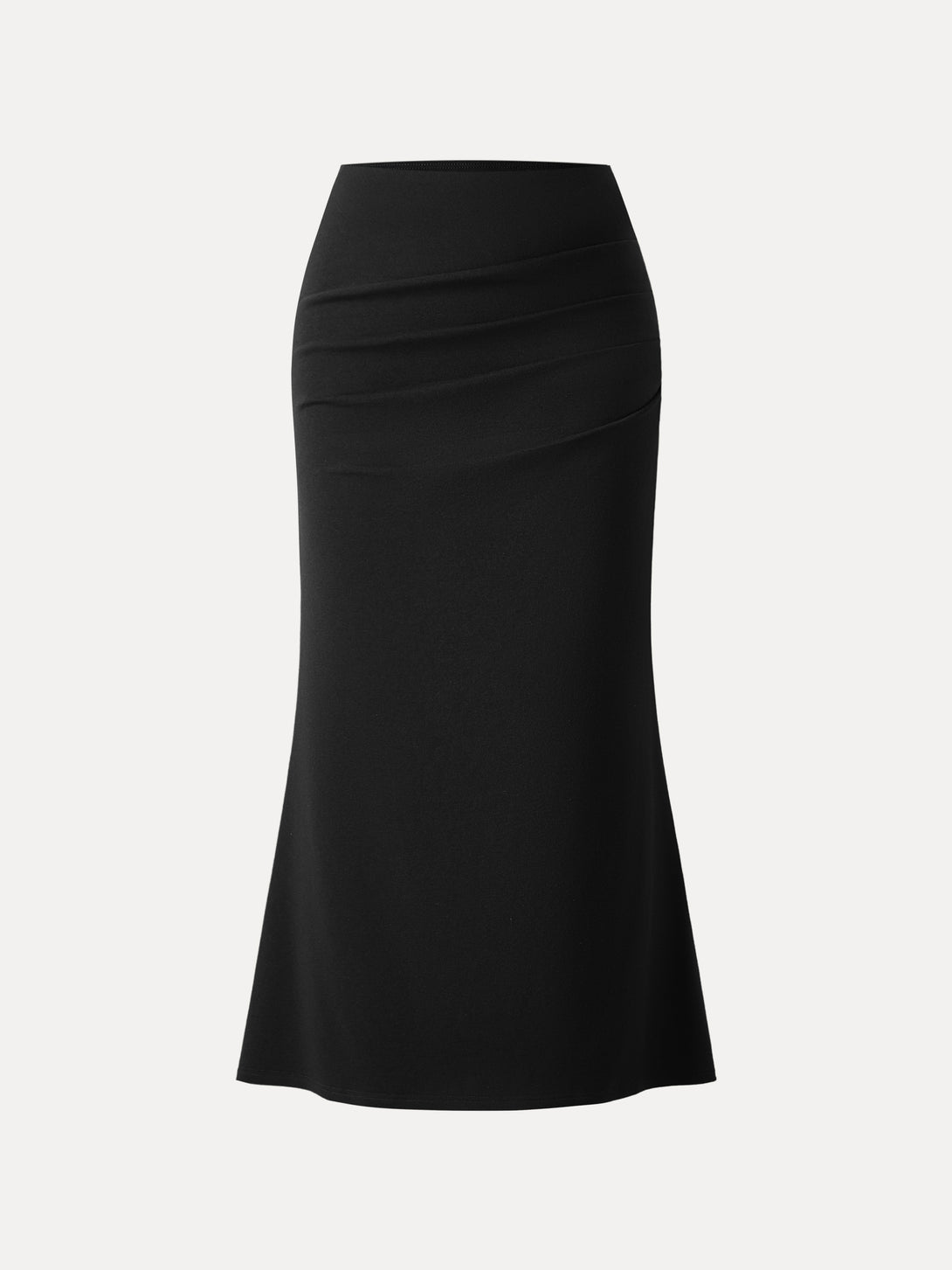This maxi skirt features tucked details and a flared hem that moves beautifully with every step. Designed with an elastic waistband for a smooth, comfortable fit, it’s a sleek and feminine piece for any occasion.