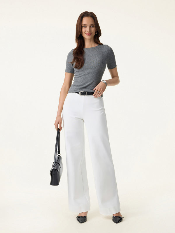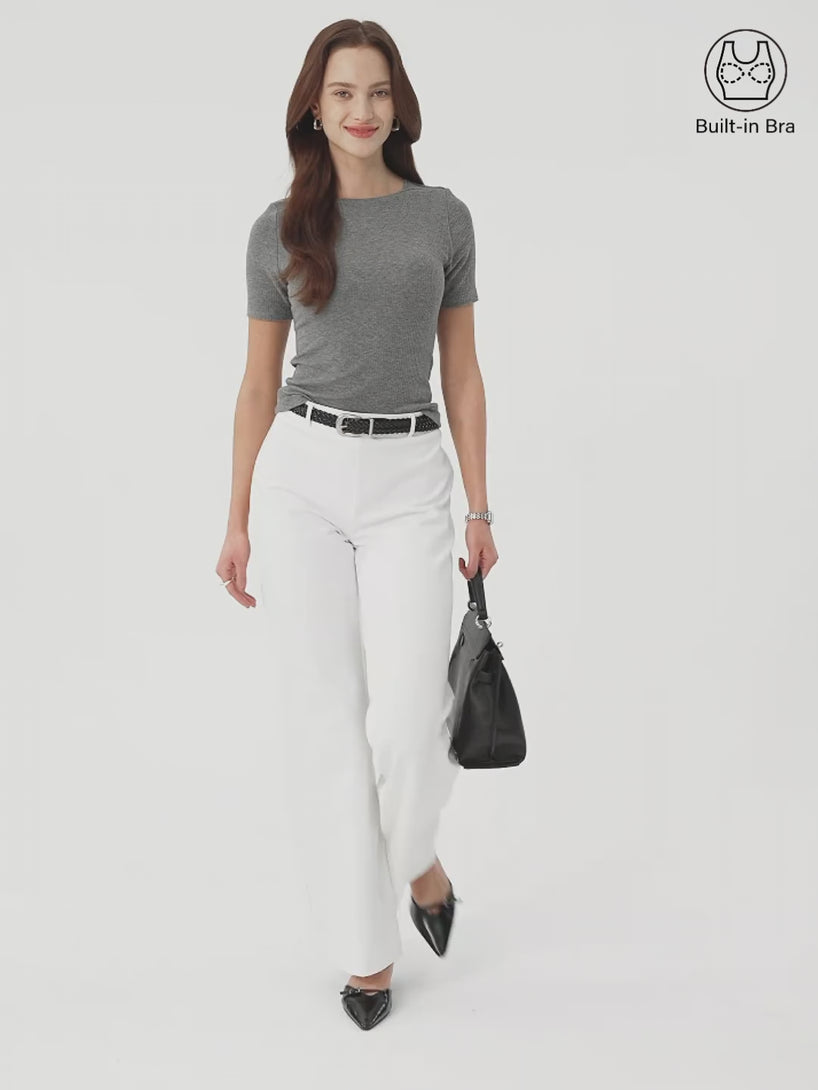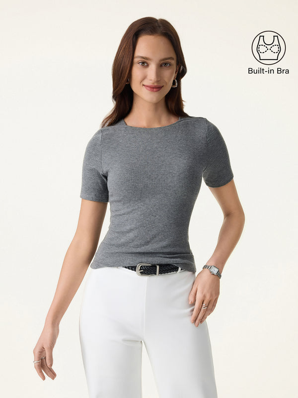 A sleek cropped tee with a boatneck and shoulder insert panel that gives the neckline a cleaner, more sculpted look. The wide rib texture adds subtle structure, short sleeves keep it easy for everyday wear, and it includes removable bra pads for comfort and support.