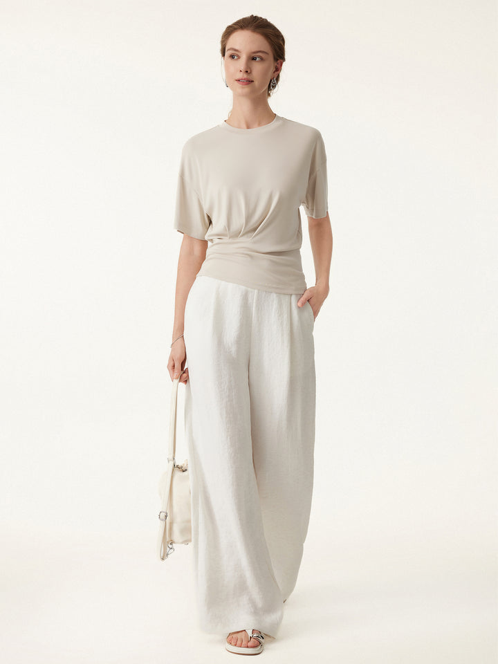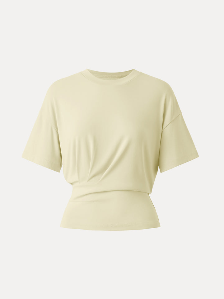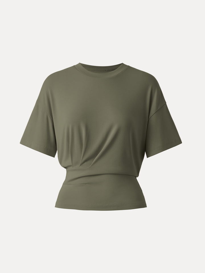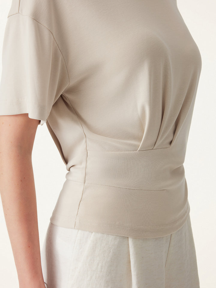 The fabric is thick and soft. Fits and flatters beautifully. With the tucks it gives the tee a more sophisticated look.