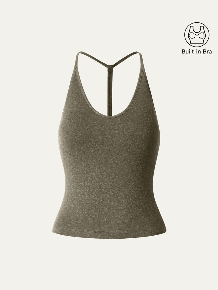 This slim-fit tank hits right at the high hip for a clean, flattering line. Featuring a sharp V-neckline and a modern T-back design, it’s built with removable bra pads for easy, polished styling—day or night.