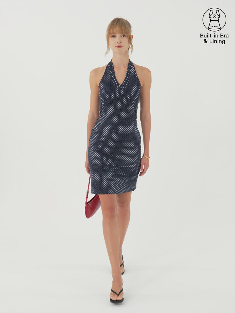 A classic polka dot halter dress that shows off your shoulders while keeping movement easy. It’s lined for confident coverage, and it includes removable bra pads for comfort and support for effortless wear.