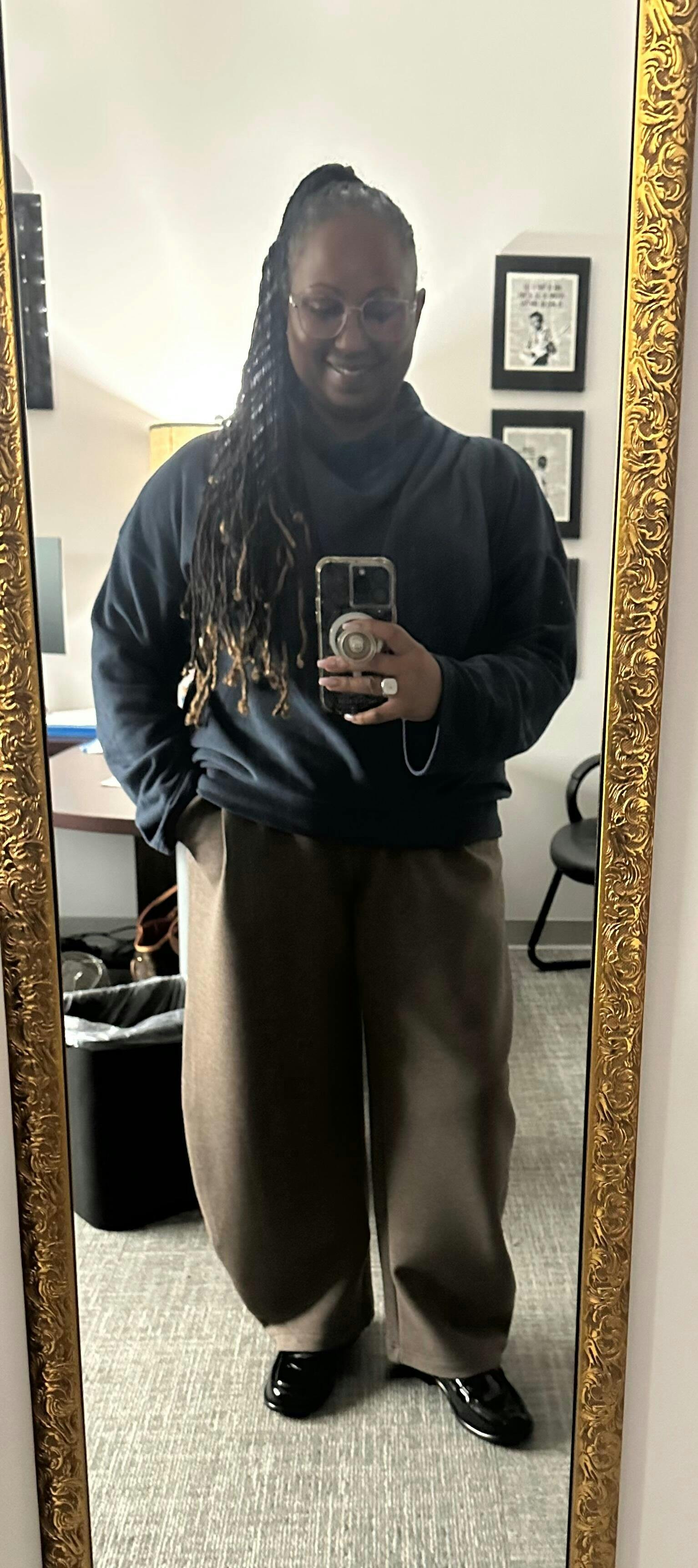I absolutely love the drape of these barrel leg pants! They’re so soft and comfortable. It’s like getting away with wearing elevated sweat pants in a professional setting. I’m a lawyer and I wore them to court, paired with a OGL cozy knit double breasted blazer. I’ve also paired them with an OGL cozy relaxed mock neck top. I wore them on days when the temp ranged from 40-70 degrees and was comfortable all day. I loved them so much that I bought three more in different colors.