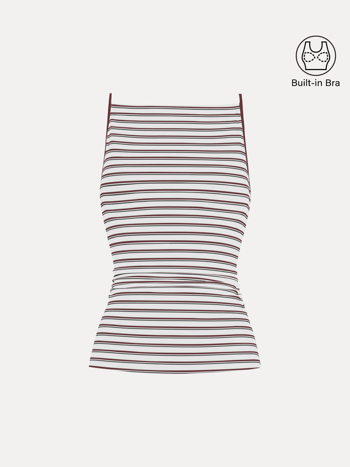 It hits at the hip with a straight neckline, spaghetti straps, and ruched sides that flatter your shape. With removable bra pads and timeless stripes, it’s your go-to for sunny days, seaside strolls, or anywhere summer takes you.