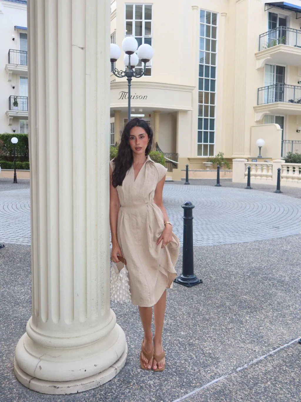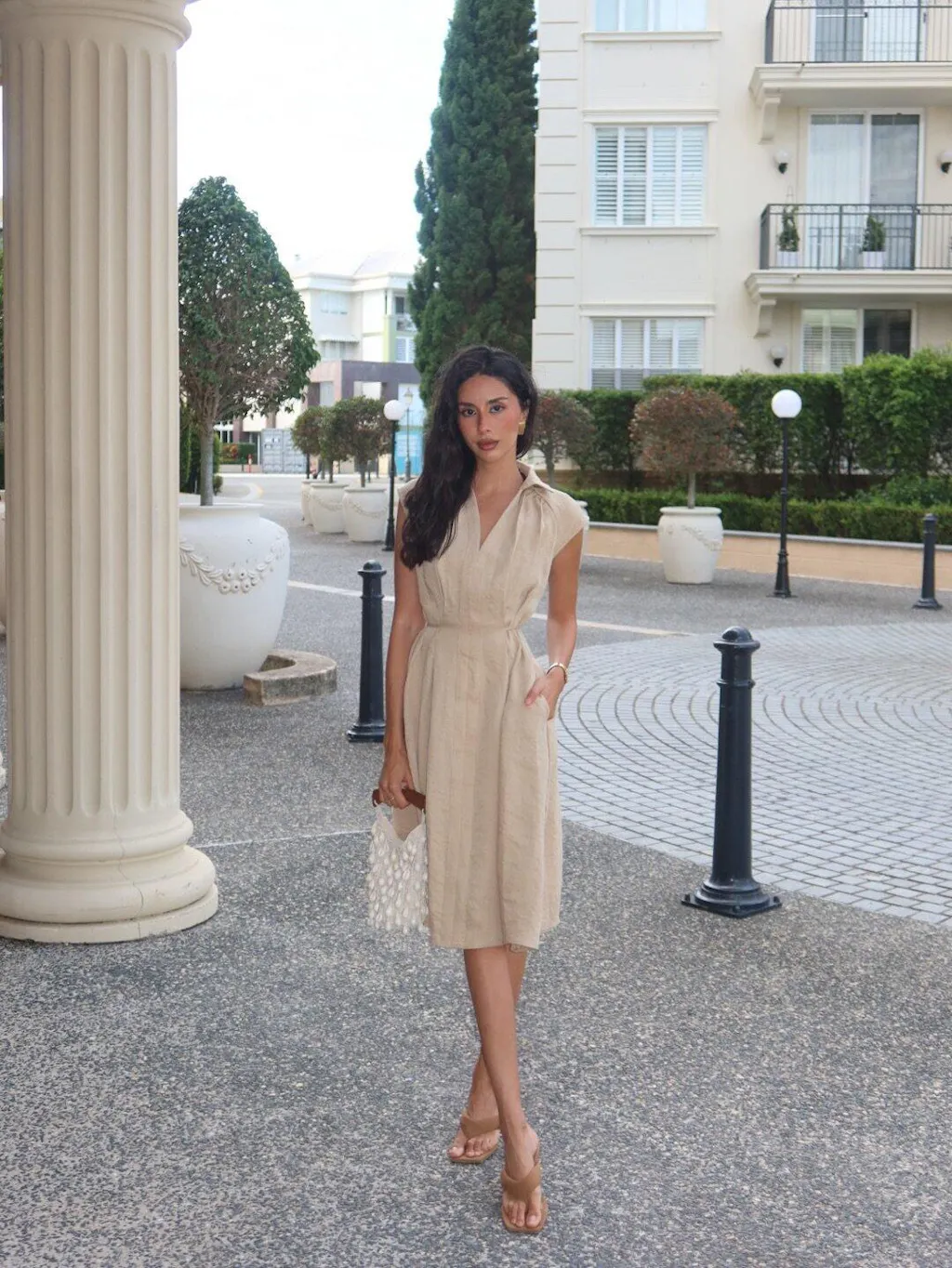 This midi dress hits the upper calf and combines a collared V‑neck with wide shoulder for structured elegance. A self‑tie waist and subtle tucks define your figure naturally. It’s a chic piece for your summer wardrobe.